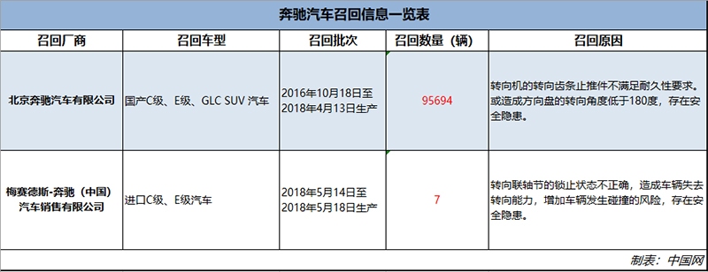 3月12日,国家质量监督管理总局发布5条召回信息,其中2条分别为梅赛德斯奔驰召回7辆进口C级、E级汽车以及北京奔驰召回95694辆国产C级、E级、GLC SUV 汽车。