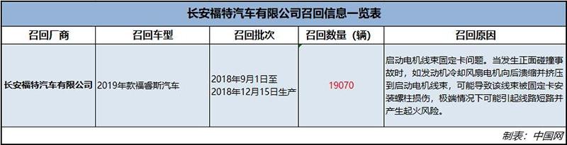 本次召回范围内的部分车辆,由于启动电机线束固定卡问题,当发生正面碰撞事故时,如发动机冷却风扇电机向后溃缩并挤压到启动电机线束,可能导致该线束被固定卡安装螺柱损伤,极端情况下可能引起线路短路并产生起火风险,存在安全隐患。长安福特汽车有限公司将为召回范围内的车辆免费更换符合设计要求的启动电机线束固定卡,以消除安全隐患。库存车辆将在消除缺陷后再进行销售。
