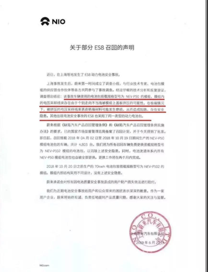6月27日,国家市场监督管理总局发布一则关于蔚来ES8的召回公告,决定自即日起,召回自2018年04月02日至2018年10月19日期间生产的搭载NEV-P50模组电池包的车辆,共计4803台。