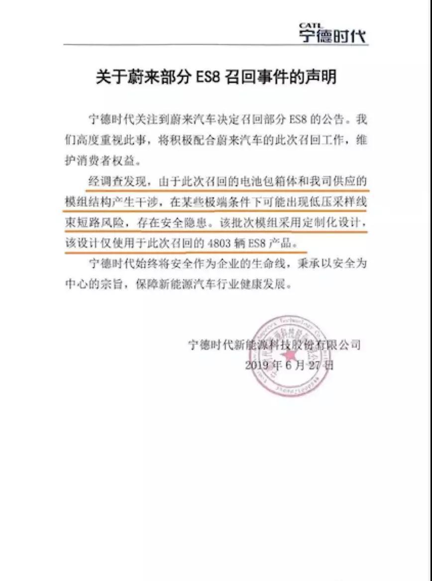 作为蔚来汽车的电池供应商,宁德时代(CATL)紧随其后发布声明表示:经调查发现,由于此次召回的电池包箱体和我司供应的模组结构产生干涉,在某些极端条件下可能出现低压采样线束短路风险,存在安全隐患。该批次模组采用定制化设计,该设计仅使用于此次召回的4803辆ES8产品。