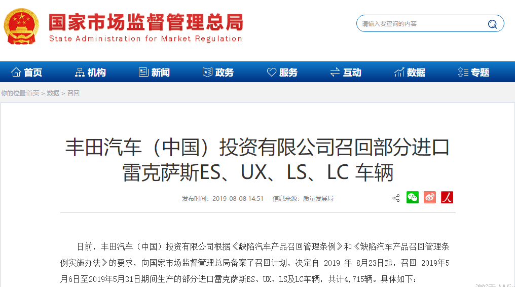 据国家市场监督管理总局网站消息,日前,丰田汽车(中国)投资有限公司根据《缺陷汽车产品召回管理条例》和《缺陷汽车产品召回管理条例实施办法》的要求,向国家市场监督管理总局备案了召回计划,决定自 2019 年 8月23日起,召回 2019年5月6日至2019年5月31日期间生产的部分进口雷克萨斯ES、UX、LS及LC车辆,共计4715辆。