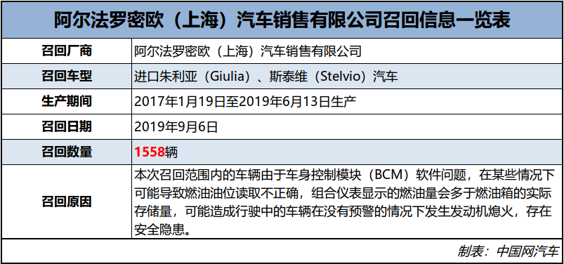 本次召回范围内的车辆由于车身控制模块(BCM)软件问题,在某些情况下可能导致燃油油位读取不正确,组合仪表显示的燃油量会多于燃油箱的实际存储量,可能造成行驶中的车辆在没有预警的情况下发生发动机熄火,存在安全隐患。阿尔法罗密欧(上海)汽车销售有限公司将为召回范围内的车辆免费升级车身控制模块软件,以消除安全隐患。