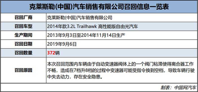 据国家市场监督管理总局信息,自2019年9月6日期,克莱斯勒(中国)汽车销售有限公司将召回2013年9月3日至2014年11月14日期间生产的部分进口2014年款3.2L Trailhawk 高性能版自由光汽车,共计372辆。
