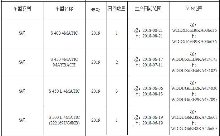 日前,梅赛德斯-奔驰(中国)汽车销售有限公司根据《缺陷汽车产品召回管理条例》和《缺陷汽车产品召回管理条例实施办法》的要求,向国家市场监督管理总局备案了召回计划,将自2019年10月15日起,召回部分进口S级汽车,共计7辆。具体如下:
