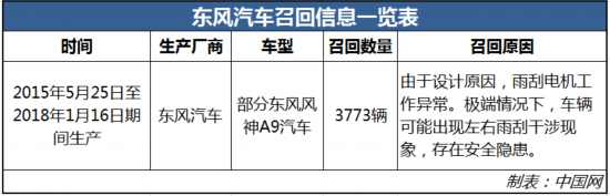 中国网汽车11月4日讯 近日,记者从国家市场监督管理总局缺陷产品管理中心官网获悉,东风汽车集团股份有限公司乘用车公司向国家市场监督管理总局备案了召回计划,自2019年11月8日起,召回2015年5月25日至2018年1月16日期间生产的部分东风风神A9汽车,共计3773辆。