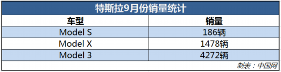 从单月成绩来看,9月份,随着特斯拉Model 3进口量的增加,特斯拉在该月进口数量约为0.43万辆新车,同比大幅增长近287%。伴随进口量的增加,特斯拉在国内的销量也有突出表现,根据乘联会9月份数据统计,特斯拉Model S的销量为186辆;Model X的销量为1478辆;Model 3的销量为4272辆。详情见下表: