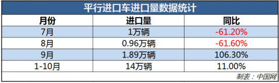 除了新能源汽车进口量增长,平行进口车也成为了一大亮点。根据数据显示,今年7、8月份,我国平行进口车在进口车市场中成绩还属较差。其中,7月份平行进口车进口量约为1万辆,同比下滑了61.2%;8月份平行进口车进口量也不理想,仅有9600辆,同比下滑了61.6%。但就在9月份,平行进口车数量则出现了大幅攀升。根据国机汽车数据统计,9月份我国平行进口汽车进口量约为1.89万辆,同比大增106.3%。今年1-10月,平行进口车数量共14.0万辆,同比上涨了11.0%,占进口总量的16%。详情见下表: