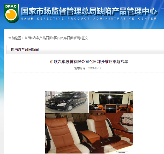 中欧汽车则宣布自即日起,召回2013年5月27日至2017年5月15日期间生产的部分ZCL5033XLJC系列汽车,共计19辆。本次召回范围内车辆选配了带一触式电视升降的车内隔断系统,由于设计存在缺陷,该隔断系统的电视机开关的操控状态不符合国家GB11552-2009《乘用车内部凸出物》强制性标准要求,存在安全隐患。
