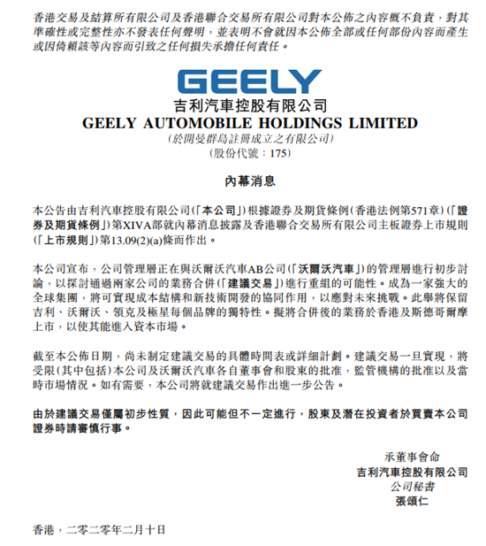 公告同时表示,截至本公布日期,尚未制定建议交易的具体时间表或详细计划。建议交易一旦实现,将受限本公司及沃尔沃汽车各自董事会和股东的批准,监管机构的批准,以及当时市场情况。