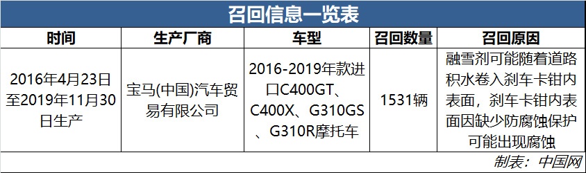 本次召回范围内部分车辆,在撒布了含有氯化钙的融雪剂的道路上使用时,融雪剂可能随着道路积水卷入刹车卡钳内表面,随着车辆使用里程增加,刹车卡钳内表面因缺少防腐蚀保护可能出现腐蚀,腐蚀如果发生在卡钳活塞密封圈处,腐蚀物可能会对活塞回位的活动自由度产生阻力。如果未察觉上述异常并及时修理,极端情况下可能出现驾驶员刹车的操作已经松开,但刹车卡钳依旧保持夹紧的制动状态,额外的制动力可能影响驾驶员对车辆平衡的控制而导致摔车,或者引起后车追尾事故,存在安全隐患。宝马(中国)汽车贸易有限公司将为召回范围内的车辆开展检查并免费更换改进后的刹车卡钳,以消除安全隐患。预计第一批召回维修用的改进零件在2020年第一季度中旬到达国内,2020年第二季度开始改进零件供应充足。