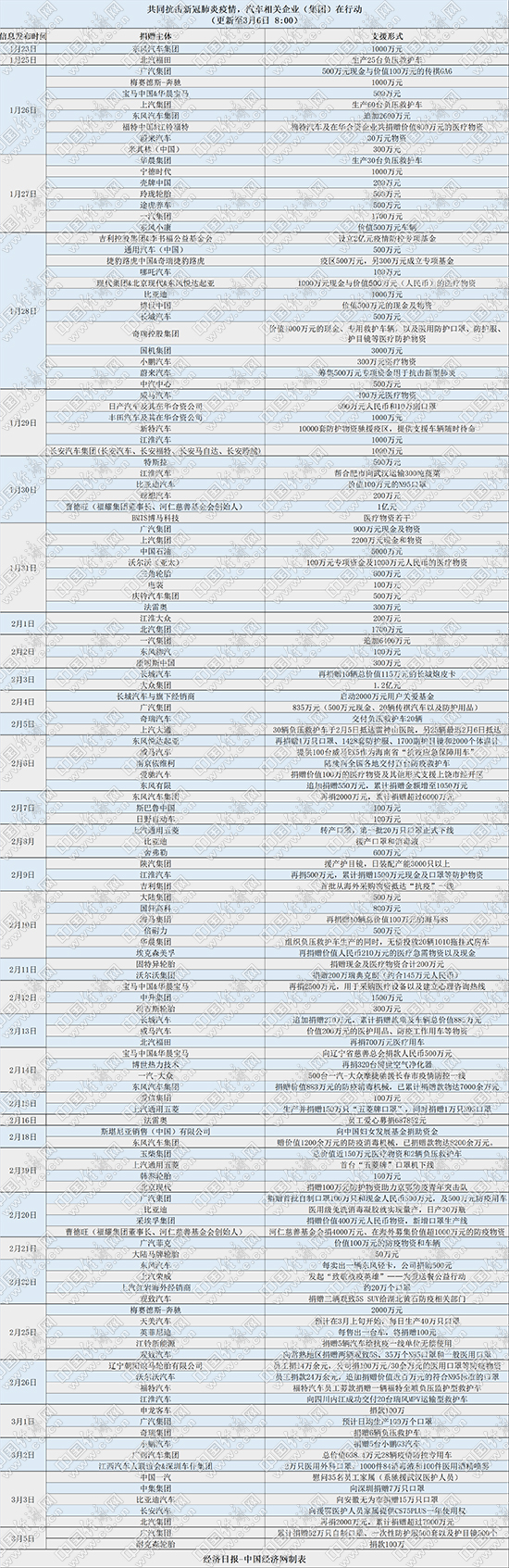 截至3月6日8时,已有76家汽车、零部件、后市场企业(集团)、汽车协会组织及个人加入到驰援疫情防控工作中,累计捐赠现金、物资及乘用车辆约合9.40亿元,负压救护车三百余辆;生产并捐赠口罩339万余只,成立专项基金2.23亿元,并各自发挥企业优势,为疫区提供便利。