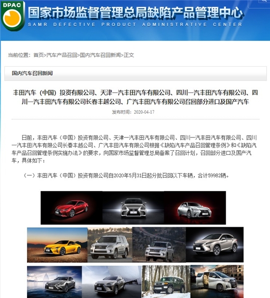 4月17日,丰田中国宣布召回25万低压燃油泵存在缺陷的汽车。本次召回范围内部分车辆,由于在低压燃油泵叶轮的制造过程中树脂成型条件不完善,导致叶轮树脂密度不足。叶轮可能会受燃油影响而发生膨润变形,并与低压燃油泵壳体发生干涉,导致低压燃油泵工作不良,极端情况下可能出现车辆行驶中发动机熄火的情况,存在安全隐患。