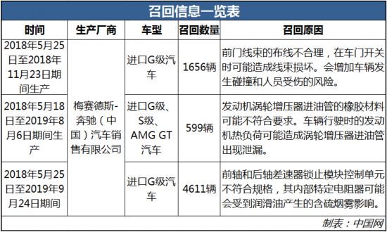 记者从国家市场监督管理总局缺陷产品管理中心获悉,梅赛德斯-奔驰(中国)汽车销售有限公司根据《缺陷汽车产品召回管理条例》和《缺陷汽车产品召回管理条例实施办法》的要求,向国家市场监督管理总局备案了召回计划,召回部分进口G级、S级、AMG GT车辆,详情见下表: