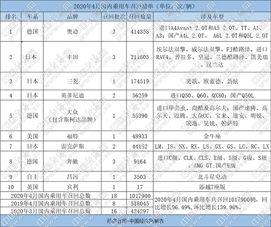 根据国家市场监督管理总局缺陷产品管理中心4月份发布的召回公告,经济日报-中国经济网汽车频道经过汇总、统计,整理出“2020年4月国内乘用车召回榜单”。4月,国内乘用车市场共有10个品牌累计发布15起公告,共计召回汽车1017900辆,同比增长96.49%,环比增长139.90%,继续保持大幅抬升走势。