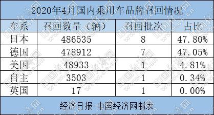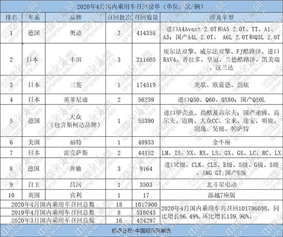 根据国家市场监督管理总局缺陷产品管理中心4月份发布的召回公告,经济日报-中国经济网汽车频道经过汇总、统计,整理出“2020年4月国内乘用车召回榜单”。4月,国内乘用车市场共有10个品牌累计发布15起公告,共计召回汽车1017900辆,同比增长96.49%,环比增长139.90%,继续保持大幅抬升走势。