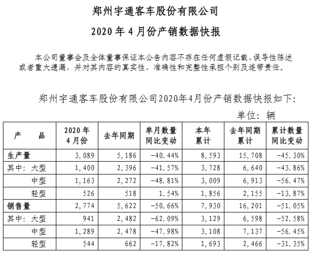 中国网汽车5月7日讯 宇通客车昨晚发布了4月份产销数据快报。数据显示,宇通客车4月份销量为2774辆,同比下降50.66%;2020年前四个月累计销量为7930辆,同比下降51.05%。