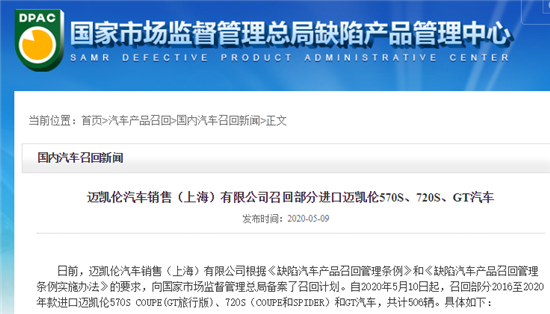 经济日报-中国经济网5月9日讯 今日,迈凯伦汽车销售(上海)有限公司发布公告称,自2020年5月10日起,召回部分2016至2020年款进口迈凯伦570S COUPE(GT旅行版)、720S(COUPE和SPIDER)和GT汽车,共计506辆。