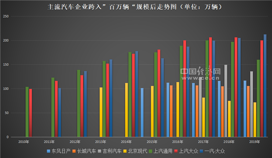 长城和吉利目前还能守住百万辆的关口,也有止步于此的企业,例如北京现代,早在2013年,北京现代便已跻身“百万辆俱乐部”。2013年销售103万辆、2014年销售112万辆、2015年销售106万辆、2016年销售114万辆,连续四年保持相对稳定。但以“萨德”事件为导火索,2017年北京现代销量大幅下滑28%,仅售出82万辆,2018年下滑至75万辆,2019年降至72万辆……