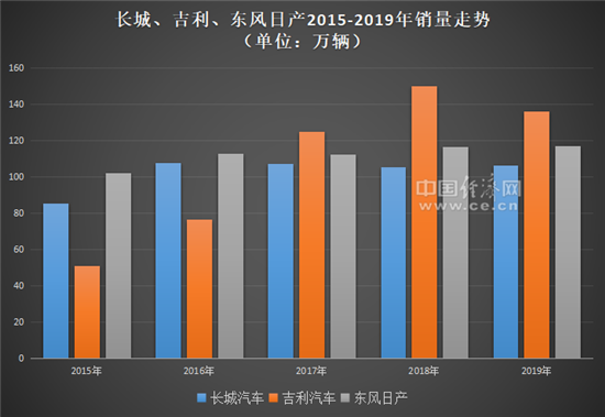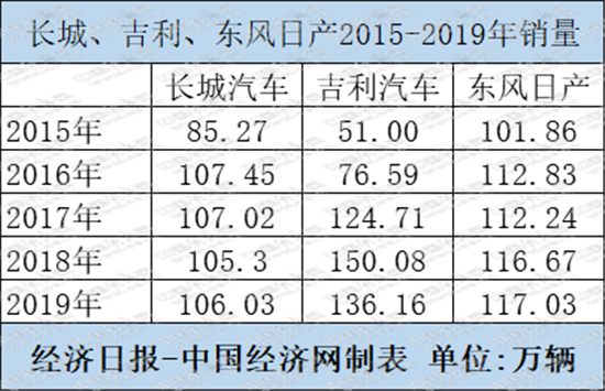 以长城和东风提产近年来的市场表现为例:2016年,长城汽车首次年销超百万辆至107.45万辆,此后几年维持在这一水平;2017年销售107.02万辆,出现小幅下滑;2018年降至105.30万辆、2019年销量为106.03万辆。东风日产境况相似,2015年,东风日产以101.86万辆的成绩正式跨越百万辆门槛,随后,2016年销售112.83万辆,2017年112.24万辆,2018年116.67万辆,2019年117.03万辆,稳健有余但增势缓慢。
