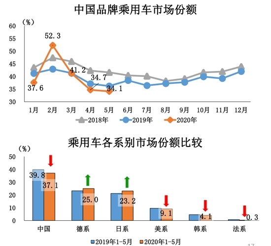 中国品牌乘用车方面,5月销量环比小幅增长,同比结束下降,共销售57.1万辆,环比增长7.1%,同比增长0.4%;占乘用车销售总量的34.1%,环比下降0.6%,同比下降2.2%,再创新低。1-5月,中国品牌乘用车市占率下降2.8个百分点至37.1%,德系、日系市占率有所提高。