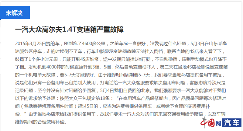 怠速、动力不足等问题频发 高尔夫车主求助无门