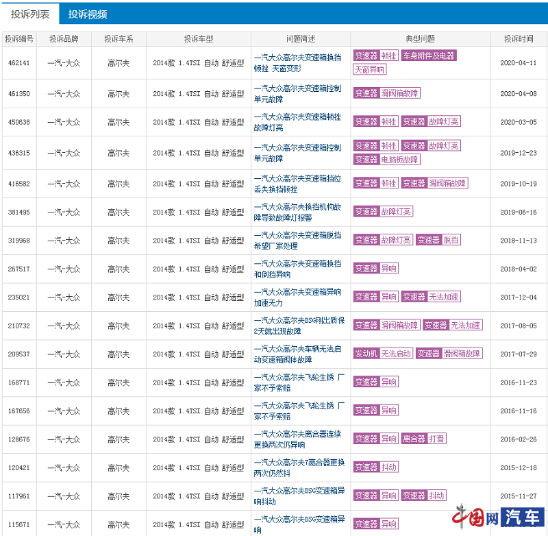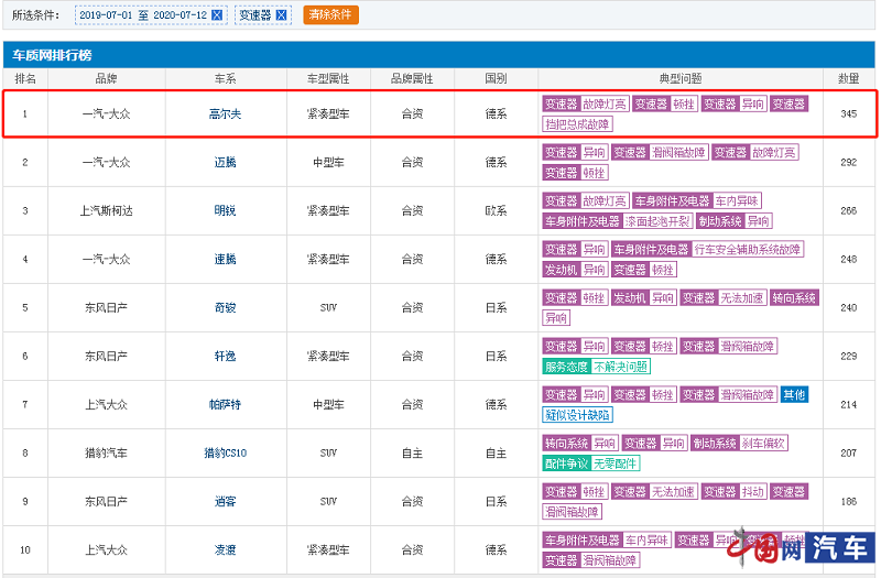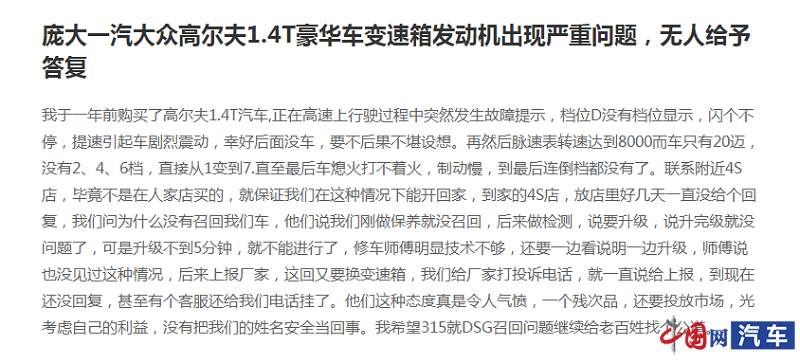 与此同时,记者还发现,仅就最近一年有关汽车变速箱故障的投诉排行中,一汽-大众高尔夫车型高居榜首,数量高达345例之多,不得不令人唏嘘。