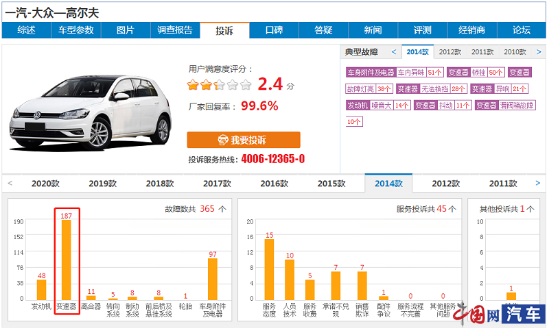 此外,在该款高尔夫车型的投诉中,有关变速箱的故障投诉数量远远超出其他故障投诉,高达187例,占据2014年款车型故障投诉总数的一半之多。
