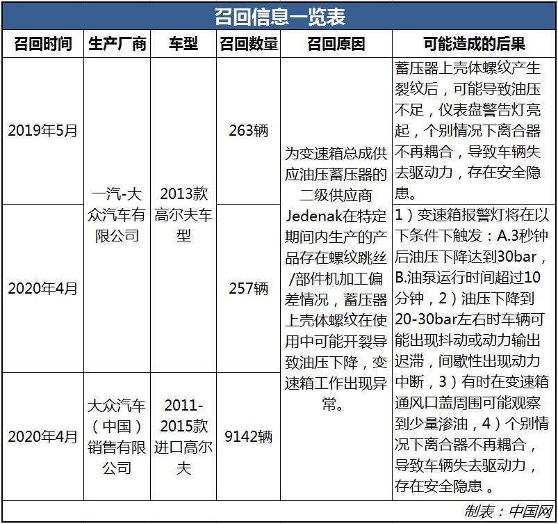 厂商频频召回 高尔夫变速箱质量问题何时得以解决?