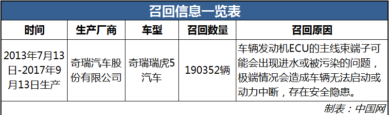 原标题:因存无法启动等安全隐患 190352辆奇瑞瑞虎5被召回