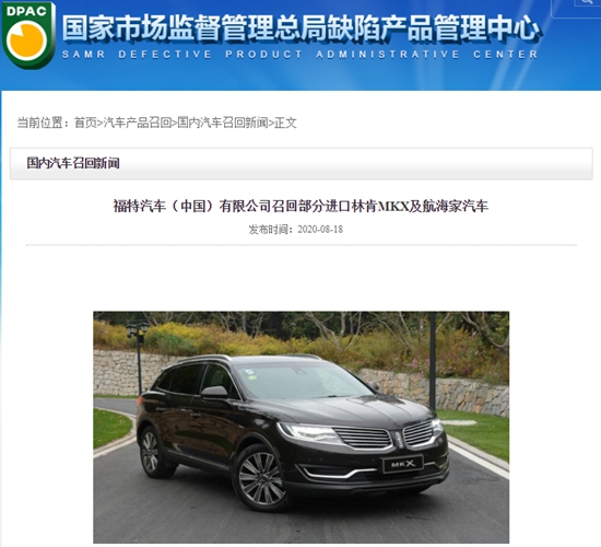 经济日报-中国经济网8月18日讯(记者 郭跃)今日,福特汽车(中国)有限公司宣布自2020年8月21日起,召回共计4010辆进口林肯MKX及进口林肯航海家汽车。