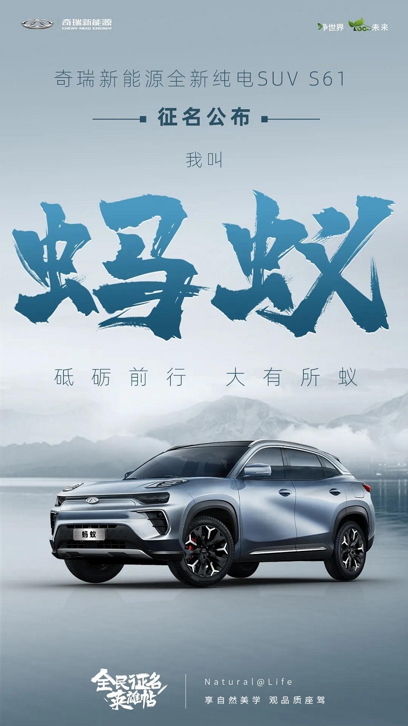 中国网汽车7月27日讯 记者日前从官方获悉,奇瑞新能源于近日公布了旗下代号为S61的全新纯电动SUV定名为“蚂蚁”。据了解,新车基于奇瑞新能源正向研发纯电平台LFS打造,续航里程为510km,或将于今年第三季度正式上市。