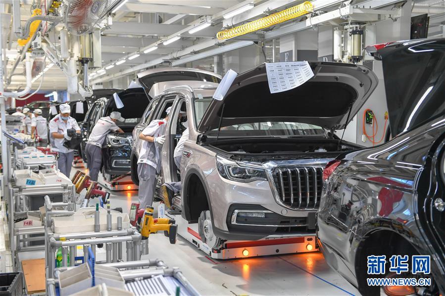 6月19日,在位于长春的一汽红旗总装车间,工人装配车辆。 记者从中国第一汽车集团有限公司获悉,该公司旗下红旗品牌汽车8月销量突破21000台,同比增长110%;1-8月累计销量突破108500台,同比增长108%。 新华社记者 张楠 摄