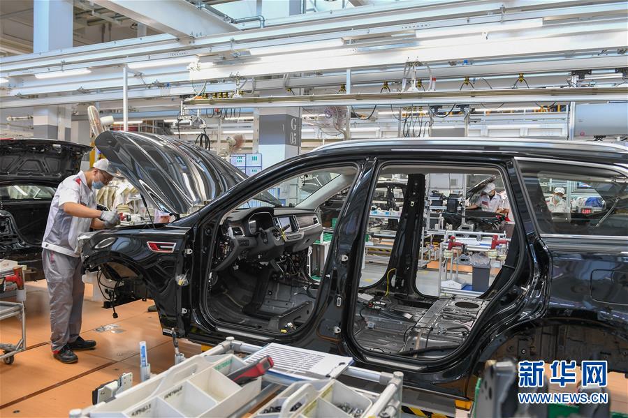 6月19日,在位于长春的一汽红旗总装车间,工人装配车辆。 记者从中国第一汽车集团有限公司获悉,该公司旗下红旗品牌汽车8月销量突破21000台,同比增长110%;1-8月累计销量突破108500台,同比增长108%。 新华社记者 张楠 摄