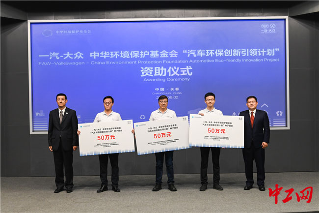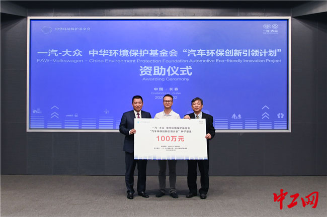一汽-大众董事、党委书记、总经理刘亦功与中华环境保护基金会理事长徐光为一等奖项目团队颁发种子基金