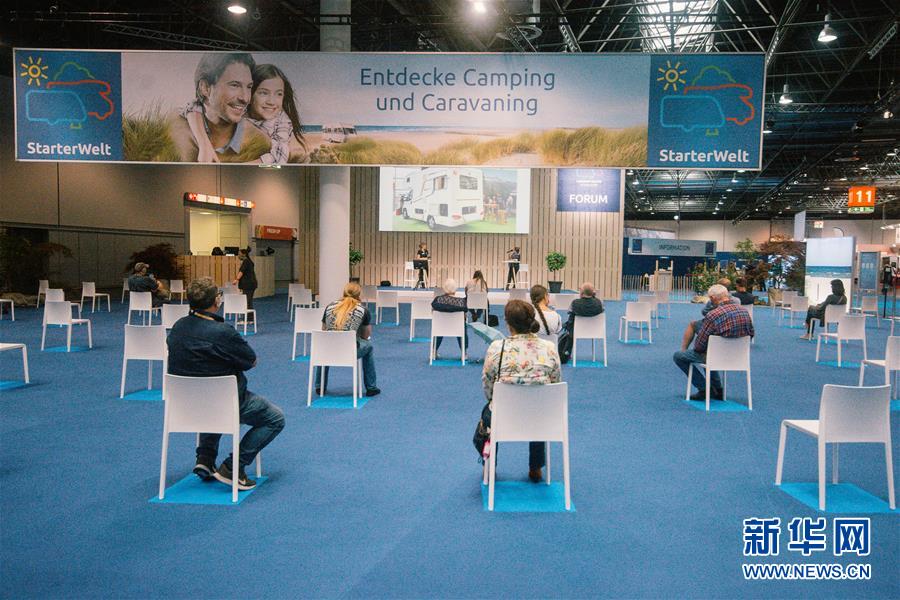 9月4日,人们在德国杜塞尔多夫房车展上保持社交距离观看介绍房车的演讲。 杜塞尔多夫国际房车展于9月4日至13日举行,吸引350余家品牌商参展。展览主办方规定入场人员要佩戴口罩,并在会场内配备消毒用品,以确保防疫安全。 新华社发(唐颖 摄)