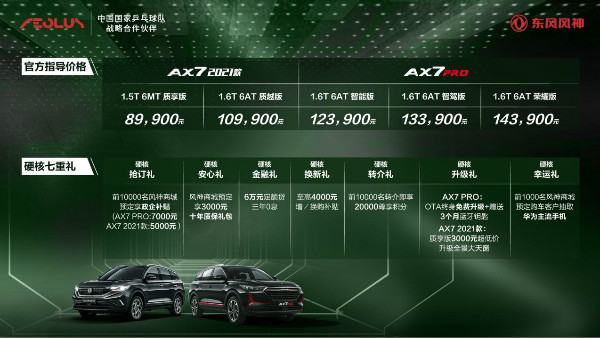 此外,为了让更多用户畅享硬核品质,凡在指定时间预定东风风神AX7 PRO和AX7 2021款车型的消费者,还可享受抢订礼、安心礼、金融礼、焕新礼、转介礼、升级礼、幸运礼等硬核七重礼,点燃本色惊喜,尽享栋梁人生。