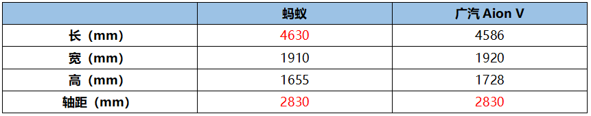 另外,空间上,蚂蚁和广汽Aion V在数据上互有赢弱,轴距均为2830mm,但蚂蚁的车身长度更长,且0.611的轴长比也以越级空间尺寸实现了乘员舱空间最大化。