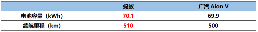再看广汽Aion V,虽然其同样搭载了三元锂动力电池,但续航里程仅500km,跟蚂蚁相比有着10km的续航劣势,且电池容量仅69.9kWh,也略低于蚂蚁。