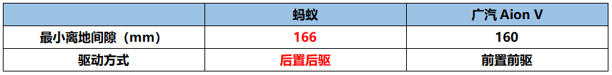而广汽Aion V则采用了同级较为常见的前置前驱布局,这也使其在转向操控性及爬坡性等方面的表现较为普通。最小160mm的离地间隙跟蚂蚁相比也略低于蚂蚁,通过性稍有劣势。
