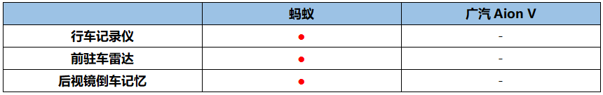 广汽Aion V在安全方面虽然也搭载了胎压监测、刹车辅助等主动安全配置,但一些驾驶中实用性较高的安全配置诸如行车记录仪、前驻车雷达以及后视镜倒车记忆等并未搭载,这些配置的缺失对新手以及女性司机来说可算不上友好。