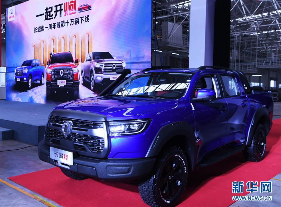 这是在长城汽车重庆永川生产基地下线的第十万辆长城炮皮卡(10月26日摄)。 当日,长城炮一周年暨第十万辆下线仪式在长城汽车重庆永川生产基地举行。自2019年8月30日投产以来,长城汽车重庆永川生产基地已累计生产长城炮皮卡10万辆,产值突破100亿元。 新华社记者 王全超 摄