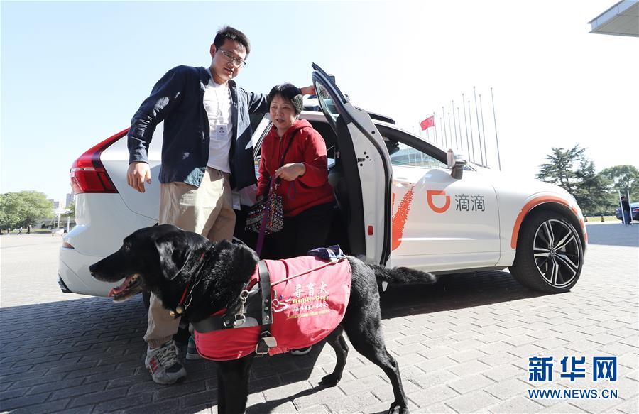10月31日,工作人员(左)引导一名视障体验者和她的导盲犬走下自动驾驶汽车。 当日,约30名受邀市民来到位于上海嘉定的上海汽车会展中心参加滴滴智能网联汽车自动驾驶体验活动。自2020年6月27日上海启动智能网联汽车规模化示范应用以来,一批智能网联汽车开始在滴滴出行App上开放服务,市民通过滴滴出行App报名并通过审核后,可以前来乘坐网约自动驾驶汽车,在真实道路上规划的示范区域内体验智能出行。 新华社记者 方喆 摄