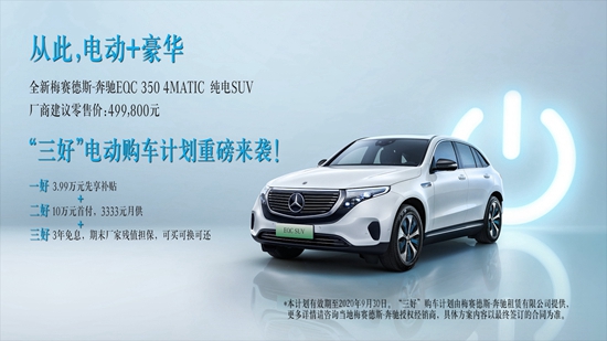 作为豪华汽车市场的标杆,奔驰自然早已“嗅到”这全新机遇。2019年11月奔驰EQC 400 4MATIC的到来,正式开启了奔驰电动化战略的号角。今年,EQC 350 4MATIC车型登场,再次丰富了产品阵容,并降低了奔驰新能源车型的入门门槛;随之而来的“三好”电动购车计划,以及“好上加好”的EQC纯电SUV “星智享”分期方案,更让消费者对“电动+豪华”触手可及。