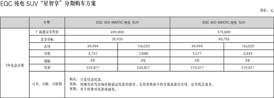 不止于此,奔驰还为用户提供了另一种“好上加好”的金融方案——EQC纯电SUV “星智享”分期方案。