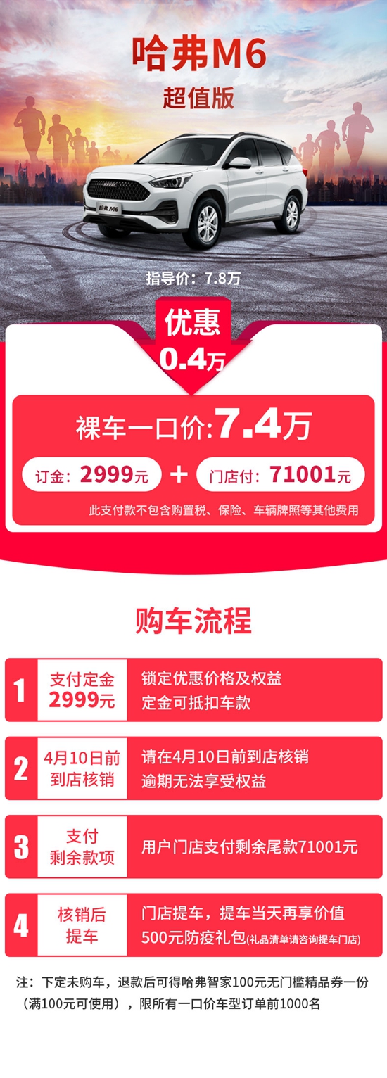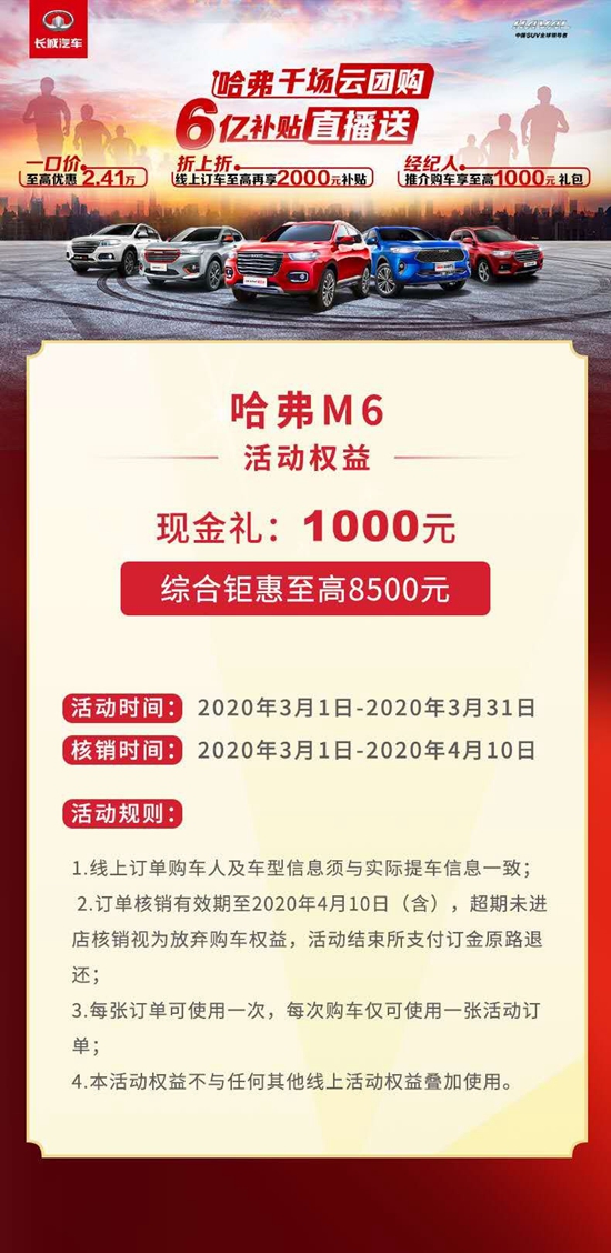 针对疫情消费者出门不便的难题,哈弗推出了"哈弗千场云团购,6亿补贴直播送"网络团购会活动!线上购买哈弗M6超值版还能享受“裸车一口价”,7.8万元的哈弗M6超值版直降0.4万元,更有”好车折上折“综合钜惠至高8500元+ 1000元现金礼。