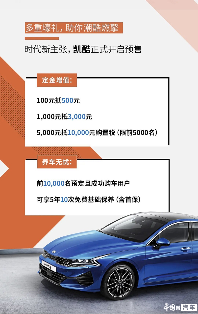 即日起凯酷开启预定,可享受100元定金抵500元和1000元定金抵3000元政策,前5000名客户更是可以享受到5000元抵10000元购置税的政策,前一万名预定且成功购车的客户可享受5年10次免费基础保养。