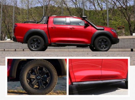 车身侧面部分,驾乘舱造型与普通乘用版保持一致,而黑色轮拱、18寸全地形轮胎都表明了这是一台越野利器。