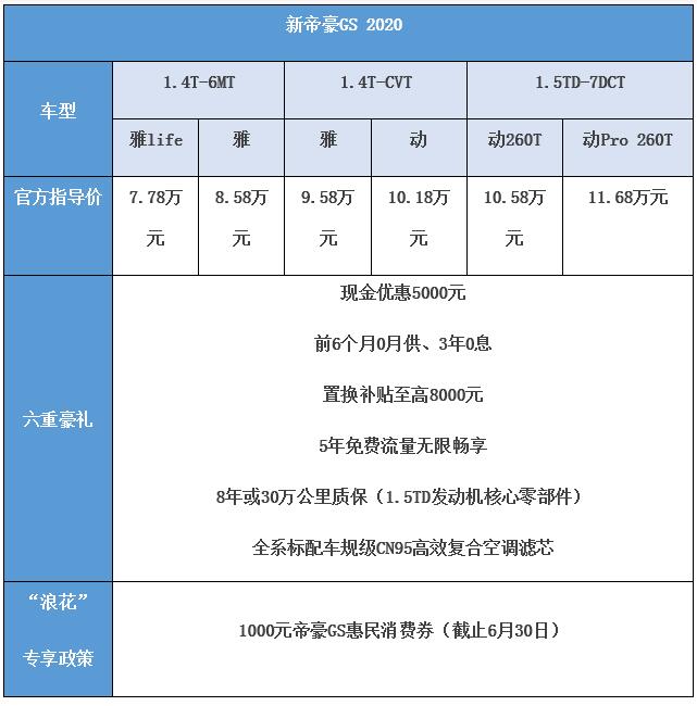 同时,新帝豪GS 2020在上市直播中还针对动静青年推出“浪花”专享政策,6月30日前购车即可享“1000元帝豪GS惠民消费券”,同时还可享受“现金优惠5000元,前6个月0月供、3年0息,置换补贴至高8000元,5年免费流量无限畅享,8年或30万公里质保(1.5TD发动机核心零部件),全系标配车规级CN95高效复合空调滤芯”等六重豪礼。
