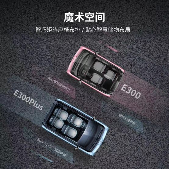 E300分体式车身设计搭配TWO-TONE双色车身配色,辨识度极高。星晧白、星空粉、星舰灰、星际蓝、星焰红等五种车身颜色,三座的E300与四座的E300Plus带来灵活座椅空间,其中E300Plus独立四座式内舱布局。