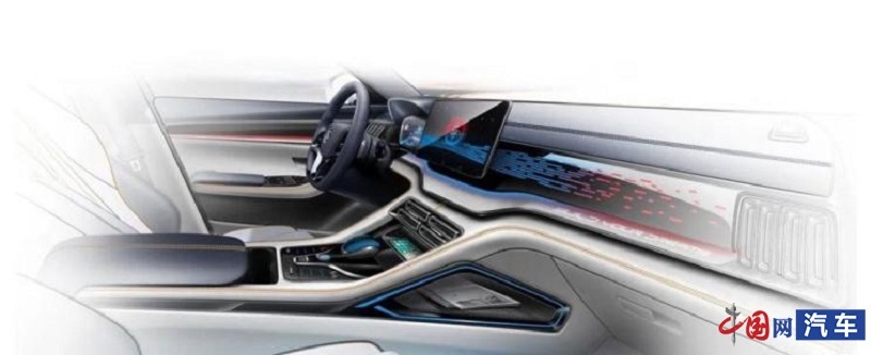细节方面,新车中控台整体设计非常简约,多采用平直的线条元素。搭配大尺寸悬浮式中控液晶屏。此外,我们还看到疑似手机无线充电板的区域,以及类似氛围灯灯带的设计,位于中控台和门板区域位置。